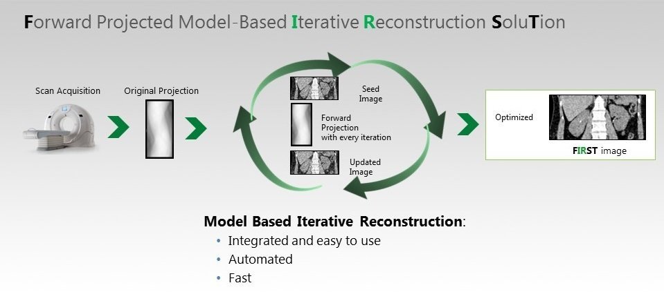 Mit MBIR, kurz für Modellbasierte iterative Rekonstruktion, bringt der Aquilion One GENESIS ein anspruchsvolles und sehr rechenintensives Tool mit, das es ermöglicht, optimale Bildergebnise von höchster Qualität bei kleinstmöglicher Dosis zu gewinnen. Für den Anwender geschieht dies dank der vollständigen Integration in das GENESIS System schnell und einfach. Mit FIRST werden vorwärts projizierte Iterationen verwendet, um die Bildqualität weiter zu steigern. Die Dosisreduktion erreicht dabei einen Wert von bis zu 82%.